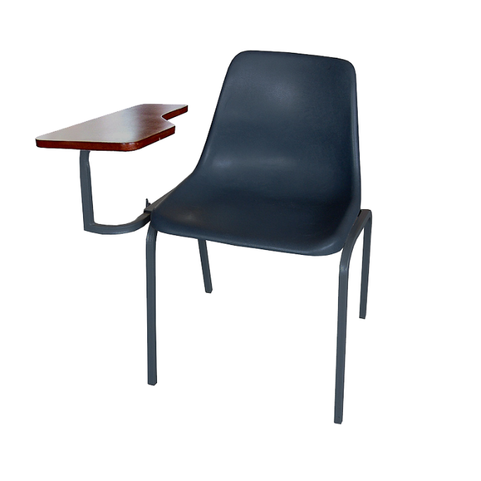 19mm Square tubing frame, grey poly shell with a 16mm thick varnished Supawood writing tablet. All steelwork epoxy powder coated.